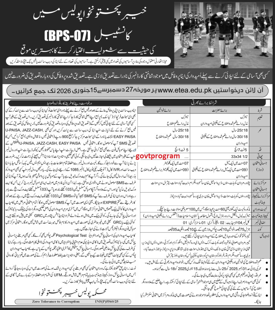 Candidates must be permanent residents of Khyber Pakhtunkhwa with valid domicile certificates. The provincial government prioritizes local hiring to ensure police forces understand the communities they serve.